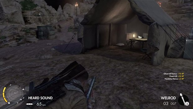 Long Shot: From the start of the mission hop down the ledges and when you get the objective to take out the search lights, continue heading east until you reach the two guards at the campfire.