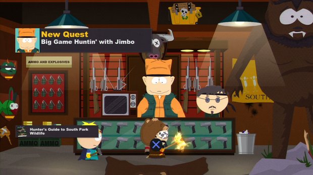 Started by purchasing the Hunter’s Guide to South Park Wildlife from Jimbo’s Guns. Kill 6 wild animals and return to Jimbo to tell him.