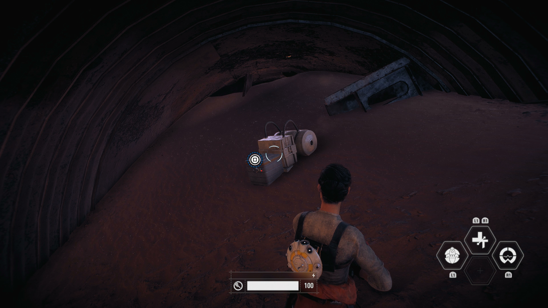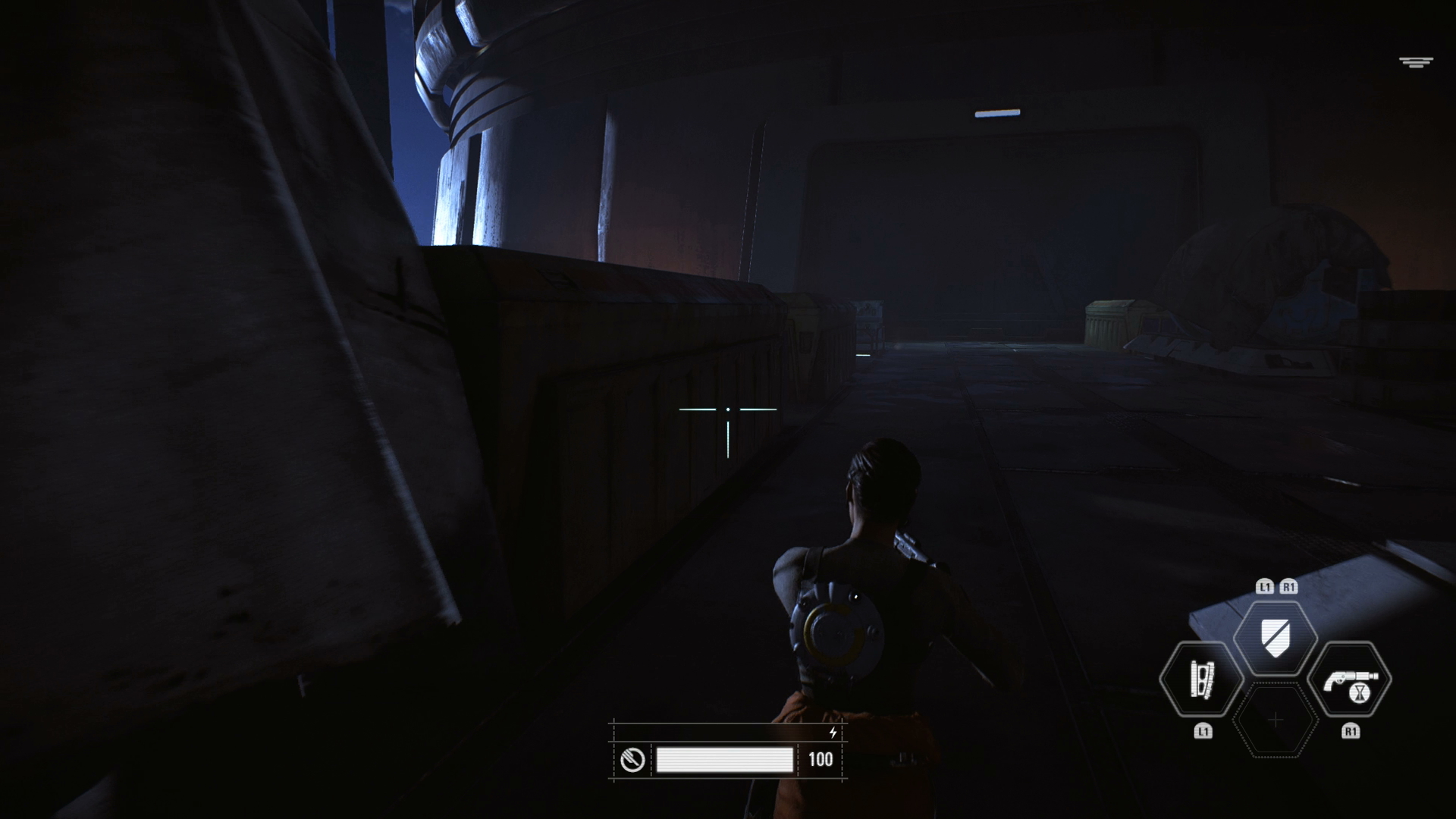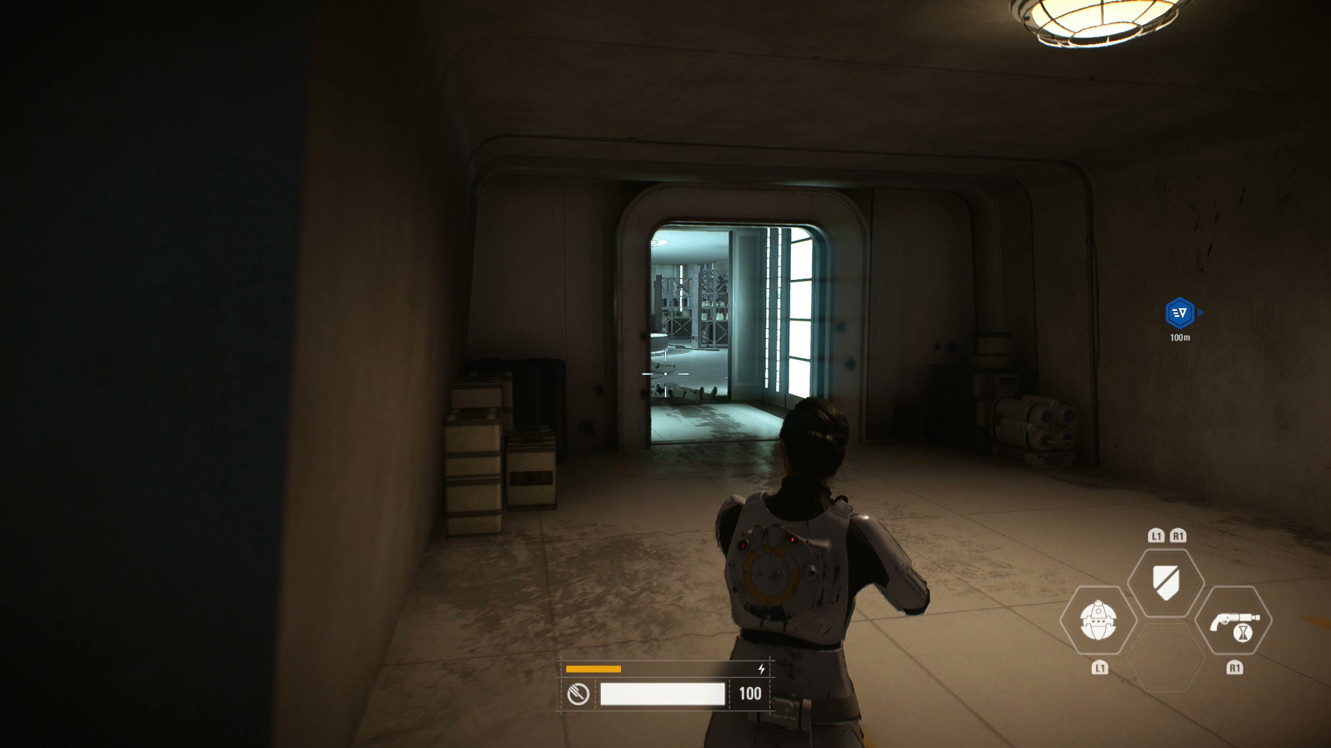 Once you've landed your X-Wing, head along the walkway to the second set of stairs on the left, where you'll find the crate sat.