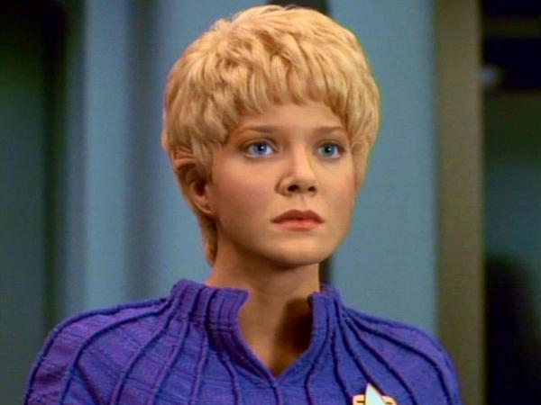 How do you make someone look alien? If you're in Star Trek , chances are they'll give you a funny forehead. Occasionally they'll forego the funny forehead for some slightly funny ears, which is what they did for Kes in Star Trek: Voyager . Except that her ears were the least of her worries. Check out that wig! It looks like someone dropped a tea cosy on the poor girl's head!