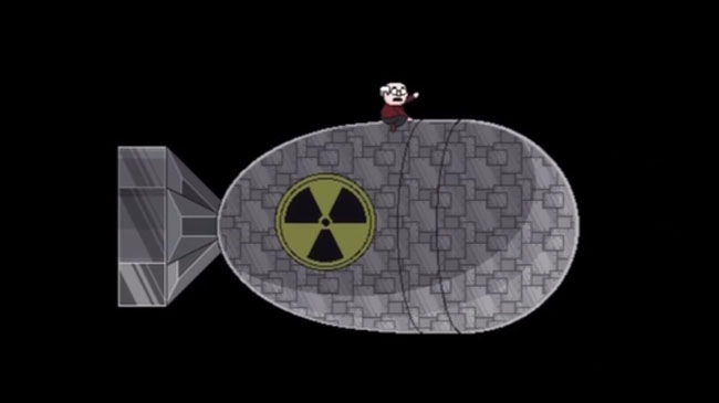 Reference: Having spent the whole episode battling Pierce's evil half-brother within the confines of an 8-bit 2D platformer (it's a long story), their nefarious enemy is finally brought down by one hell of a special move - a digital Pierce riding a giant nuclear bomb to victory, a la Strangelov e's iconic Major Kong-riding bomb drop.