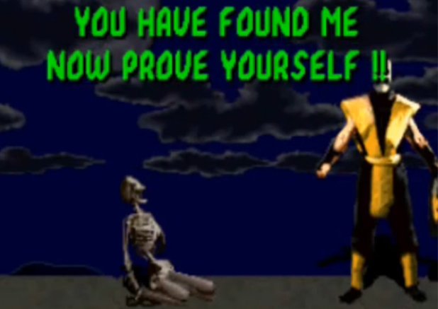 Not content with two palette swapped ninjas, the MK team tossed in a third, secret martial artist who was only accessible after certain criteria were met. Meeting Reptile wasn’t easy; you had to wait until a silhouette flew across the moon on the Pit level, and then win two perfect victories, never touch the block button and perform a fatality. All this just to fight a green ninja with moves stolen from Sub-Zero and Scorpion!