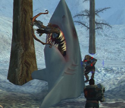 After so many games in which sharks play the villain, it’s nice to see a rare instance of them helping you out. This is thanks to the Land Shark Gun, also known as “The Best Thing about Armed and Dangerous.”