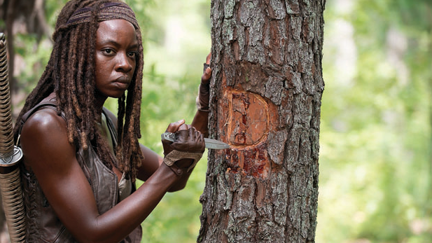 Before you know it, Rick and Michonne are holding hands and ohmigodisthishappening they kiss… pause… and kiss again… before waking up naked; clothes, guns and blades strewn on the floor. It's a left-field plot development, but feels right. The pair have lived through a lot, and are evenly matched in terms of what it takes to survive in the new world, not having lost their appetite to live, or nurture those they love (note the tender exchange between Carl and Michonne outside the house, where chiding turns to embrace). How their relationship develops isn't clear, but it does lend an extra frisson – and, for Rick and Michonne, a potential moral weakness – as the show inches toward its unveiling of ultra-bad comic book villain Negan, due in the season finale.