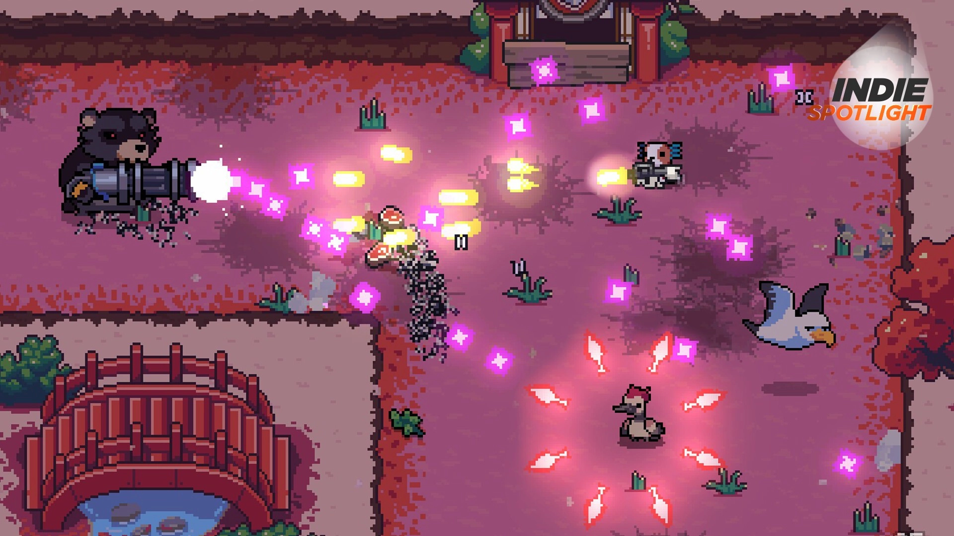 Success hinges on your ability to manipulate the advancing horde of furry foes, using your trusty dodge roll to get around their shots and natural barriers like walls and water to create some space for yourself. There's a deliberate weight to your movement that means if you let yourself get backed into a corner, the likelihood that you'll escape unscathed is pretty low. Instead, draw advancing critters back and forth, ducking around their cartoonishly-signposted attacks as you hit them back. Relatively early in the game, I unlocked a laser pistol with a piercing effect that would hit any enemy in a line, and learning to corral opponents together as you kited around them was key to helping me advance.