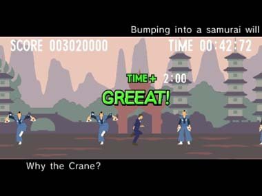 There are nine stages, each lasting a minute or so, and as a besuited man with no facial features your job is merely to reach the exit, before celebrating with a victory dance. (There’s split-screen, four-man multiplayer too.) The man runs right automatically and you only use one button, tapping A to dodge obstacles like women, joggers and manholes. The closer you are to the obstacle without hitting it, the better your score; each successful interaction grants a speed boost and a sliver of extra time.