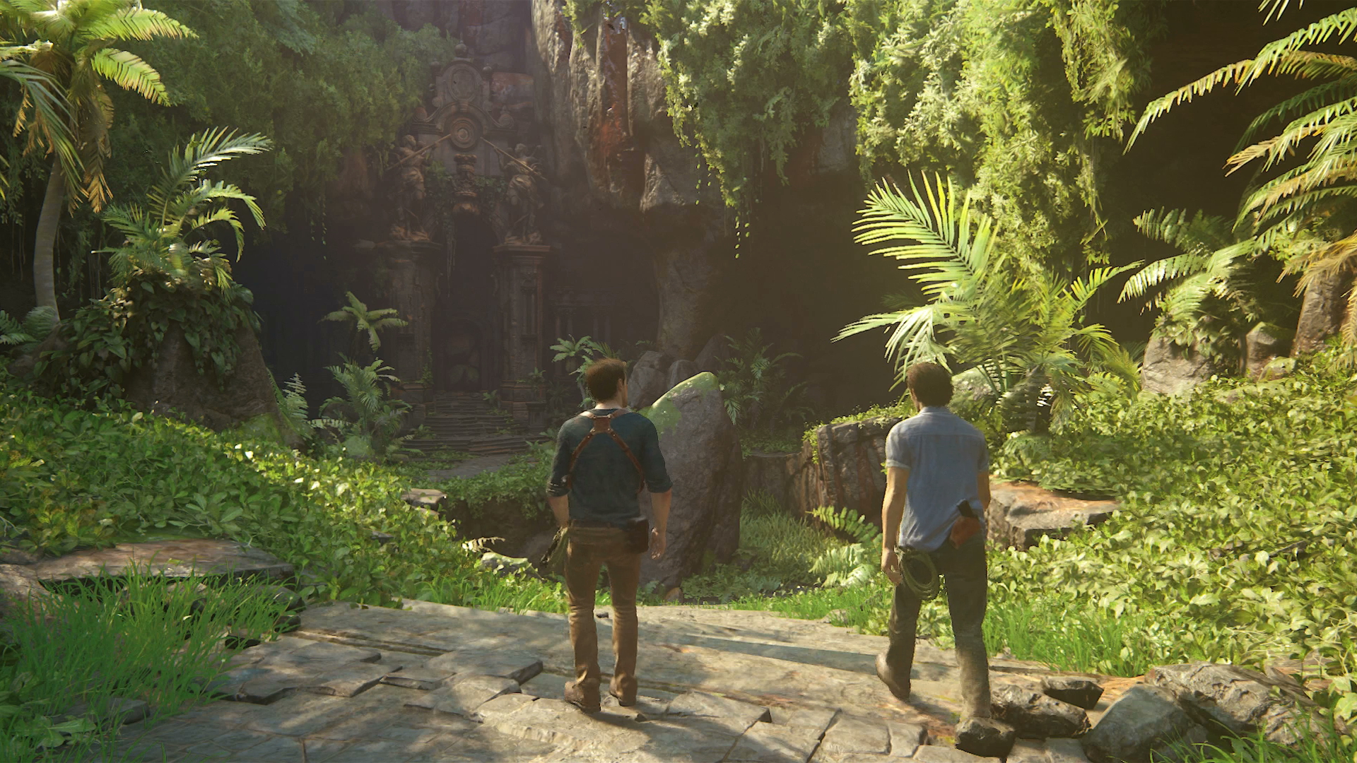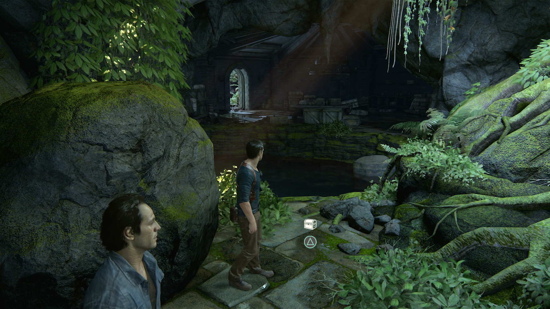 Once Sam has broken the bridge, climb up and jump over to the opposite platform then look inside the small cave through the archway.