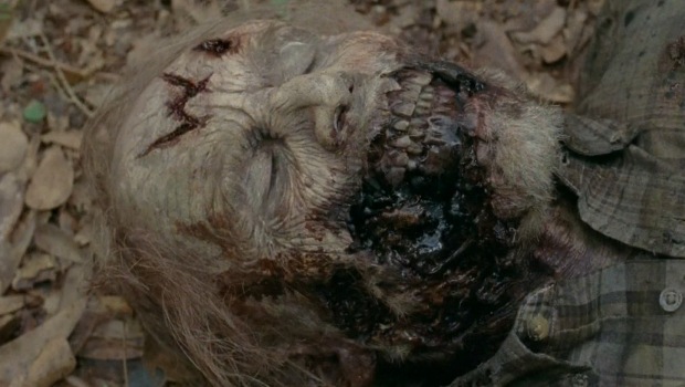 We find another dead walker with “W” carved into its forehead. There's been some speculation that it's an upturned “M” for Morgan, but that seems highly unlikely. We've speculated that it's foreshadowing a renamed version of the Saviours before, but there's also the possibility that it's the Whisperers – a new faction introduced into the comic recently.