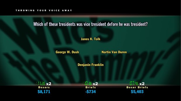 Also new is the welcome addition of the Wrong Answer of the Game, which almost always rewards a game-changing amount of cash to the idiot lucky enough to choose it. There is some strategy involved with finding these, since the answers are thematically linked to each game's sponsor mentioned before the episode starts. So, for example, in the game sponsored by Supreme Court Children's Hospital, eagle-eyed players should watch for incorrect answers clearly inspired by that goofy product.